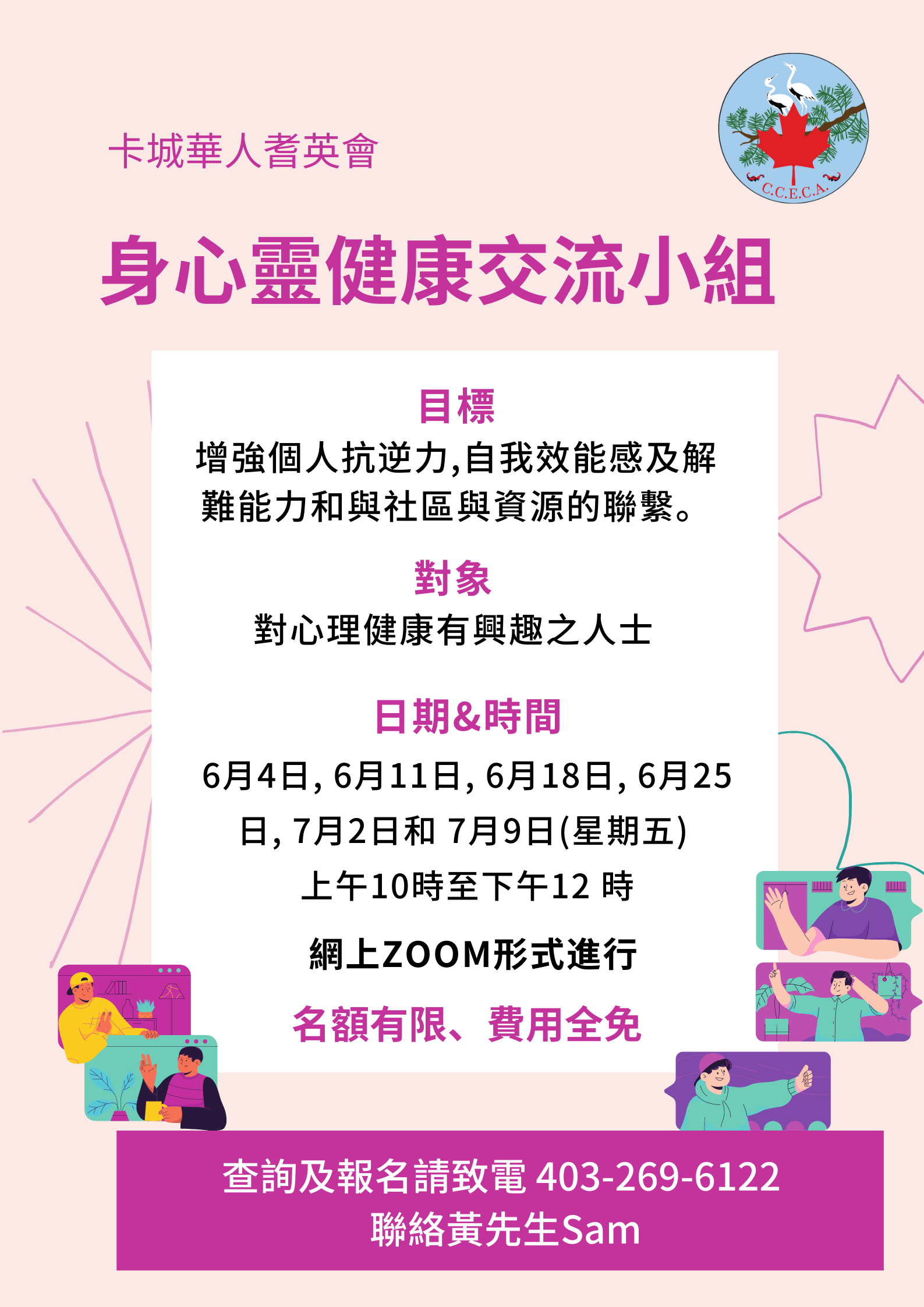 對象:對心理健康有興趣之人士 目標:增強個人抗逆力,自我效能感及解難能力和與社區與資源的聯繫。